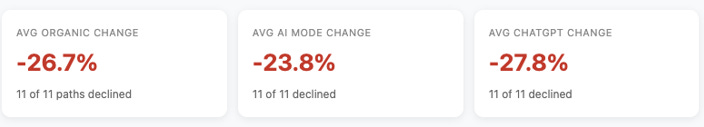 Google’s AI Mode (-23.8%) and ChatGPT (-27.8%) showed the most severe declines, closely mirroring the -26.7% average drop in organic traffic.