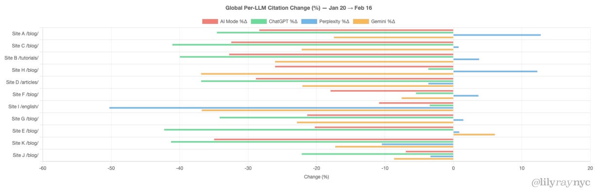 While Gemini also saw broad declines (10 of 11 sites), Perplexity proved to be the most resilient, with only 4 of the 11 sites seeing a drop and a much milder average change of -2.9%.