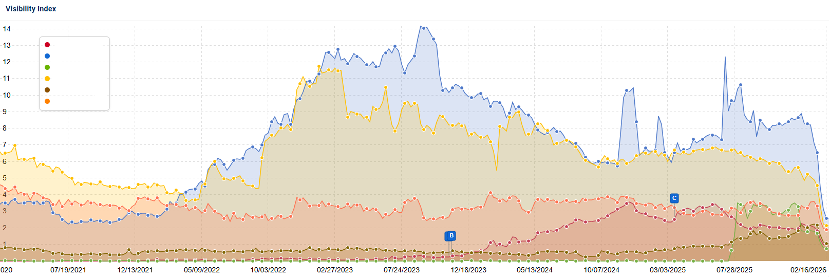 That same organic trajectory has continued into mid-February for all of the subfolders I analyzed, using the Sistrix U.S. Visibility Index:
