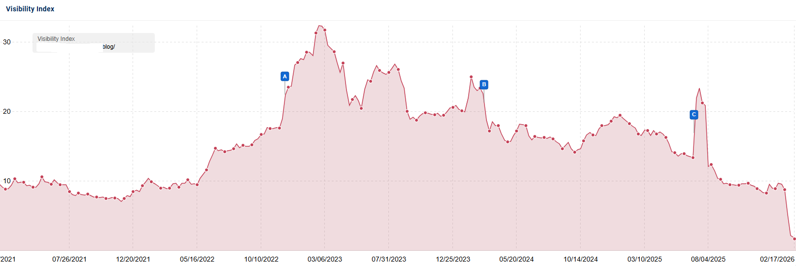 Here is another example of the visibility impact on the company blog for the biggest company in the list (in terms of both ARR and organic visibility):