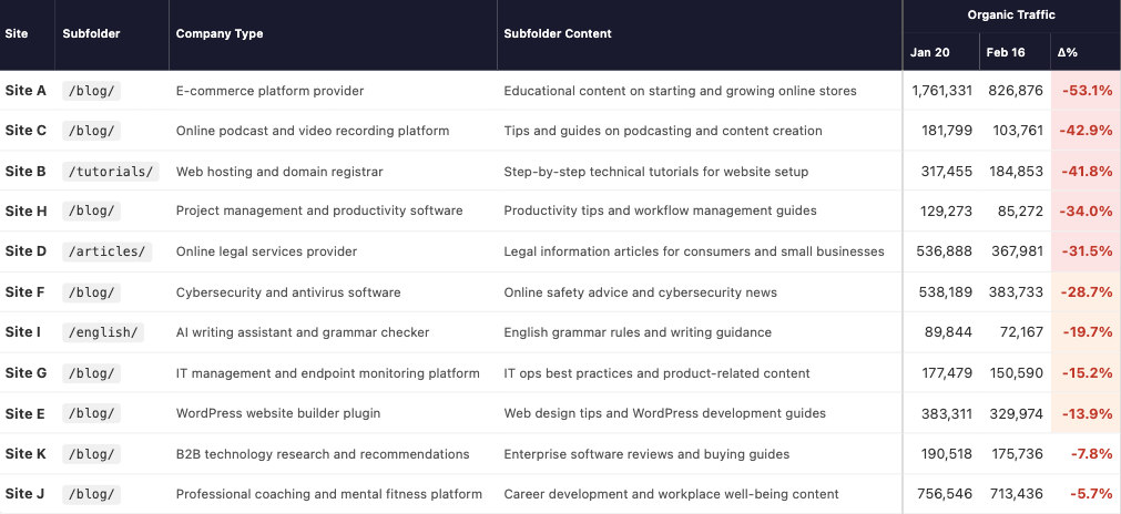 To start, I honed in on a list of 11 sites whose subfolders saw substantial organic traffic drops between January 20, 2026 and February 16, 2026.